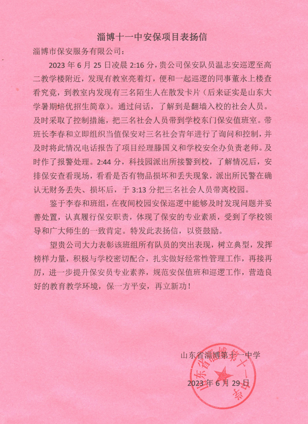 6月29日市保安公司駐淄博市第十一中學(xué)崗點收到學(xué)校送來的一封感謝信。信中對保安隊員溫志安、董永以及班長李春和項目負(fù)責(zé)人滕國義提出表揚。6月25日凌晨2時16分,派駐淄博第十一中學(xué)保安隊員溫志安、董永巡邏至高二教學(xué)樓附近發(fā)現(xiàn)有三名陌生人在散發(fā)卡片(后來證實是山東大學(xué)暑期培優(yōu)招生簡章)。通過問話,了解到是翻墻入校的社會人員,及時采取了控制措施,班長李春和及時將此情況電話報告了項目負(fù)責(zé)人滕國義和學(xué)校安全辦負(fù)責(zé)老師,并及時作了報警處理。2時44分,科技園派出所接警到校,了解情況后,確認(rèn)無財物丟失、損壞后,于3時13分把三名社會人員帶離校園。為表彰先進(jìn)、弘揚正氣,在保安隊伍中積極營造干事創(chuàng)業(yè)、爭先創(chuàng)優(yōu)的良好氛圍,7月11日上午,對以上四名同志作出相對應(yīng)的現(xiàn)金獎勵,十一中校領(lǐng)導(dǎo)和公司項目負(fù)責(zé)人召開專題會議共同為隊員進(jìn)行了表彰。“平凡崗位,點滴熱忱”李春和班組,在夜間校園安保巡邏中能夠及時發(fā)現(xiàn)問題并妥善處置,認(rèn)真履行保安職責(zé),不僅體現(xiàn)了市保安公司保安隊員的專業(yè)素質(zhì),而且為其他保安隊員樹立了學(xué)習(xí)的榜樣。