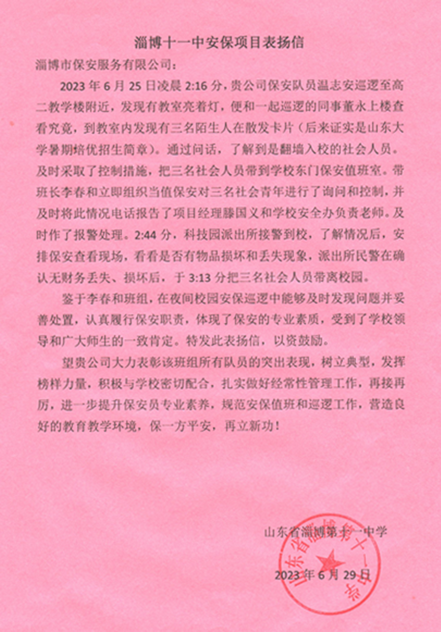 近日,淄博市校園安保抓到三名社會人員翻墻入校散發(fā)暑期培優(yōu)招生簡章,及時采取控制措施并報告校方安辦負(fù)責(zé)人,同時進(jìn)行報警處理。得到了校方的一致好評,并送上了表揚信。