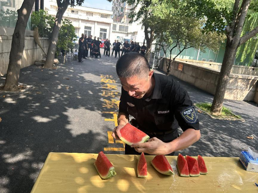 活動設(shè)有“大象轉(zhuǎn)圈”、“吃西瓜比賽”等項目,隊員們以車組為單位進(jìn)行了激烈的角逐,大家一邊享受比賽的激情一邊品嘗西瓜的清爽,樂趣無窮。最終有兩組隊伍獲得優(yōu)勝獎,隊長張波將清涼解暑的冷飲送到獲獎隊員手中,同時叮囑大家注意飲食,適當(dāng)補充淡鹽水,不要貪涼,保持夏季健康,以最好的狀態(tài)投入勤務(wù)工作。